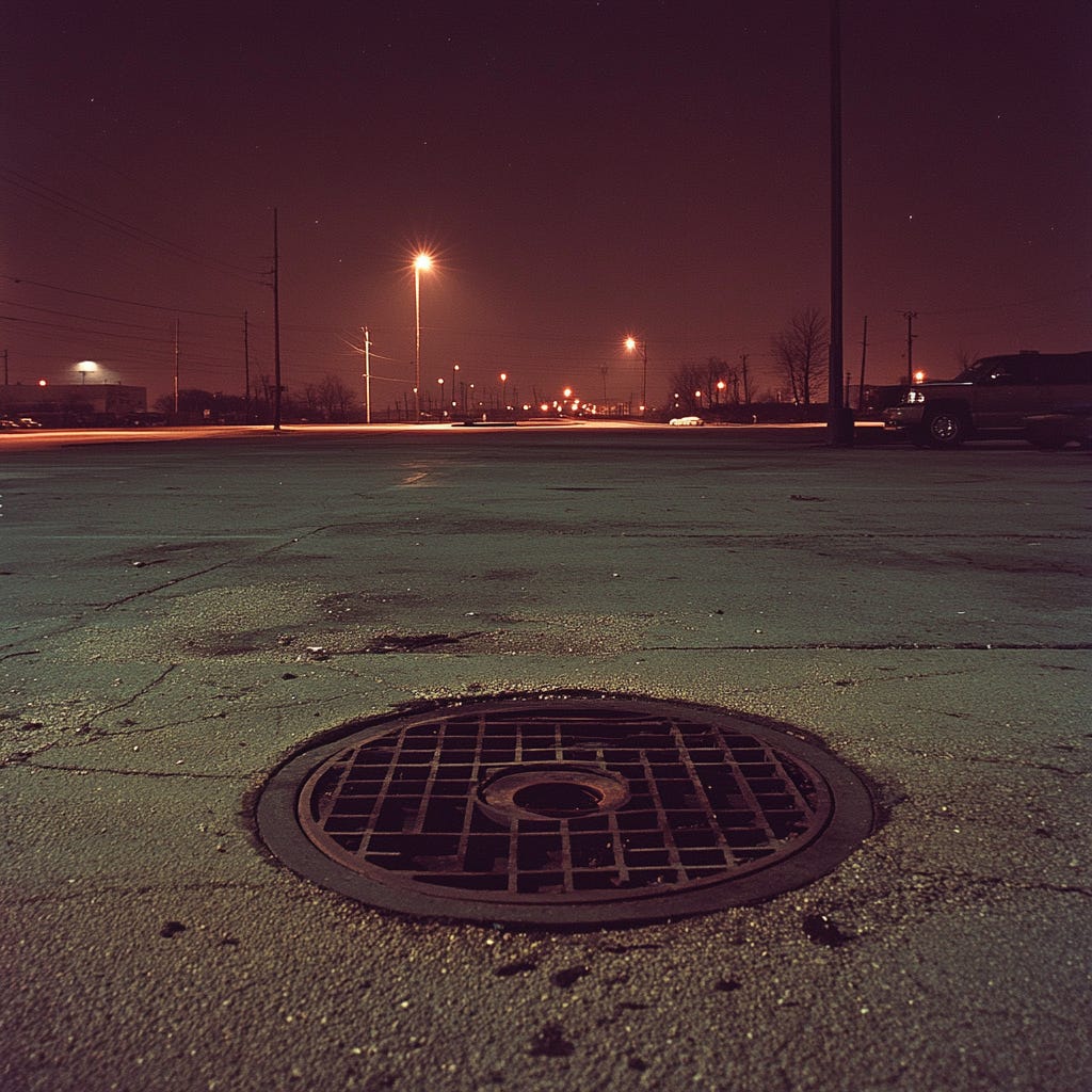 Near the center of the lot was a manhole cover, rimmed with rust, its surface streaked with dark stains. It sat slightly ajar, and the faint scrape marks around its edge were the only indication of any actual use.